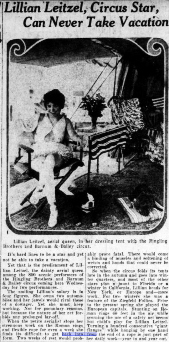 “Lillian Leitzel, Circus Star, Can Never Take Vacation” in The Constitution (Atlanta, Georgia; Tuesday, October 25, 1927)