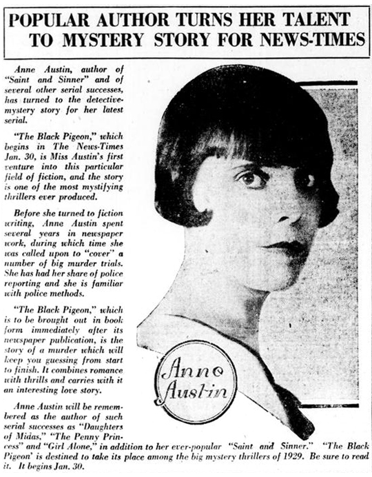 “Popular author turns her talent to mystery story for News-Times,” South Bend News-Times (January 22, 1929)