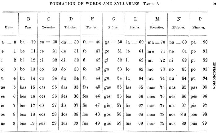 “For the formation of words, I use the five short vowels a, e, i, o, u, and the five long vowels, as, es, is, os, us, which I combined with the nine consonants b, c, d, f, g, l, m, n, p, in the manner shown in the following table [shown above]. Every word consists of groups of two letters commencing at the left of the word; the last group at the right may have but one letter, which is always a vowel.