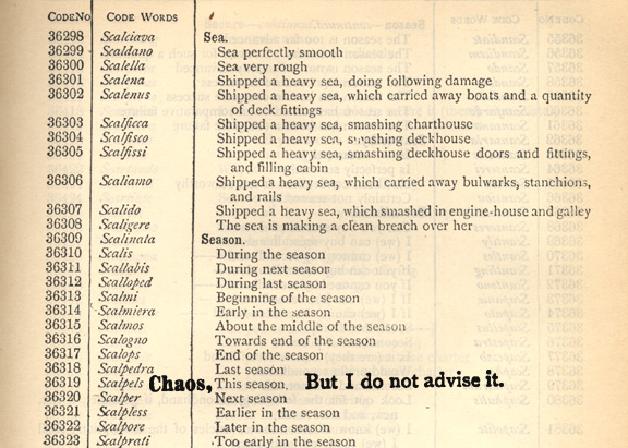 Chaos from The Adams Cable Codex (Third Edition, 1896), Sea from The ABC Universal Commercial Electric Telegraphic Code (Fifth Edition, 1901).