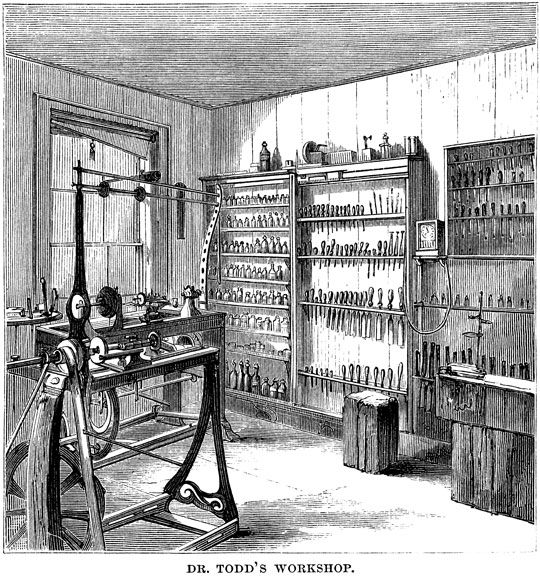 (Life: 480-83). But the hobby that stood above the others was his workshop. The description of that well-equipped and supplied shop (shown above) is remarkable:He had hardly established a home of his own when the tinkering that housekeeping calls for led him to procure a few carpenter’s tools, and from time to time he added to the assortment as occasion arose. Before long he obtained a rude lathe, mostly of his own construction; and soon he had a large shop, containing a work-bench, blacksmith’s forge and anvil, and a turner’s lathe, with a respectable lot of tools for working in wood and metal. A few years before he died, he accidentally came into possession of a remarkably fine lathe and set of tools accompanying it, and from that time he began to accumulate the furniture of a first-rate turner’s shop. A room in the house adjoining his study was appropriated to it, where he could guard his implements from the meddling of others, especially servants, and could have his recreation near his desk, so that he could turn to it at any moment. His friends took pleasure in encouraging his fancy with many gifts of tools and money for special designated purposes; until at last he had a valuable and quite famous workshop. Several descriptions of it have been published. Three or four lathes, a buzz-saw, scroll and jig saws, a fine bench with an anvil, and a perfect little steam-engine of about half-horse power, constituted the main furniture; while all around, the four walls were covered with cases containing several hundred tools, many of them of the finest and most complicated structure and costliest character. There were whole cases of bottles containing oils, varnishes, gums, and paints. There were rows upon rows of boxes of nails, brads, and screws of every possible size and shape. There were drawers upon drawers of rare woods and blocks of ivory, imported from Africa especially for him, in the rough and in various stages of manufacture. Some of the tools were so complicated that it seemed impossible for any one to learn how to use them; but it was his boast that he knew the use of every instrument, and knew the place of each so well that he could lay his hand on it in the dark. That he made no great use of all these tools will readily be understood. He did, indeed, learn the use of them, and acquire a creditable skill in the management of them; and he made a number of very prettily worked articles. Scarce one of the family but has some specimen of his handiwork, in the shape of an ivory box, a match-safe, a shawl-pin, or something of the kind. But he was too busy a man with his pen to spend much time in mechanical operations; and, after all, it was the collecting and arranging of his implements which he enjoyed, rather than the use of them in hard labor, for which, in fact, his infirmities unfitted him. He took the greatest care of his tools, keeping every one of them well-oiled and in its place, wiping off all particles of dust or rust from their shining surfaces as softly as tears from the faces of children. They were too precious to be put to ignoble uses.